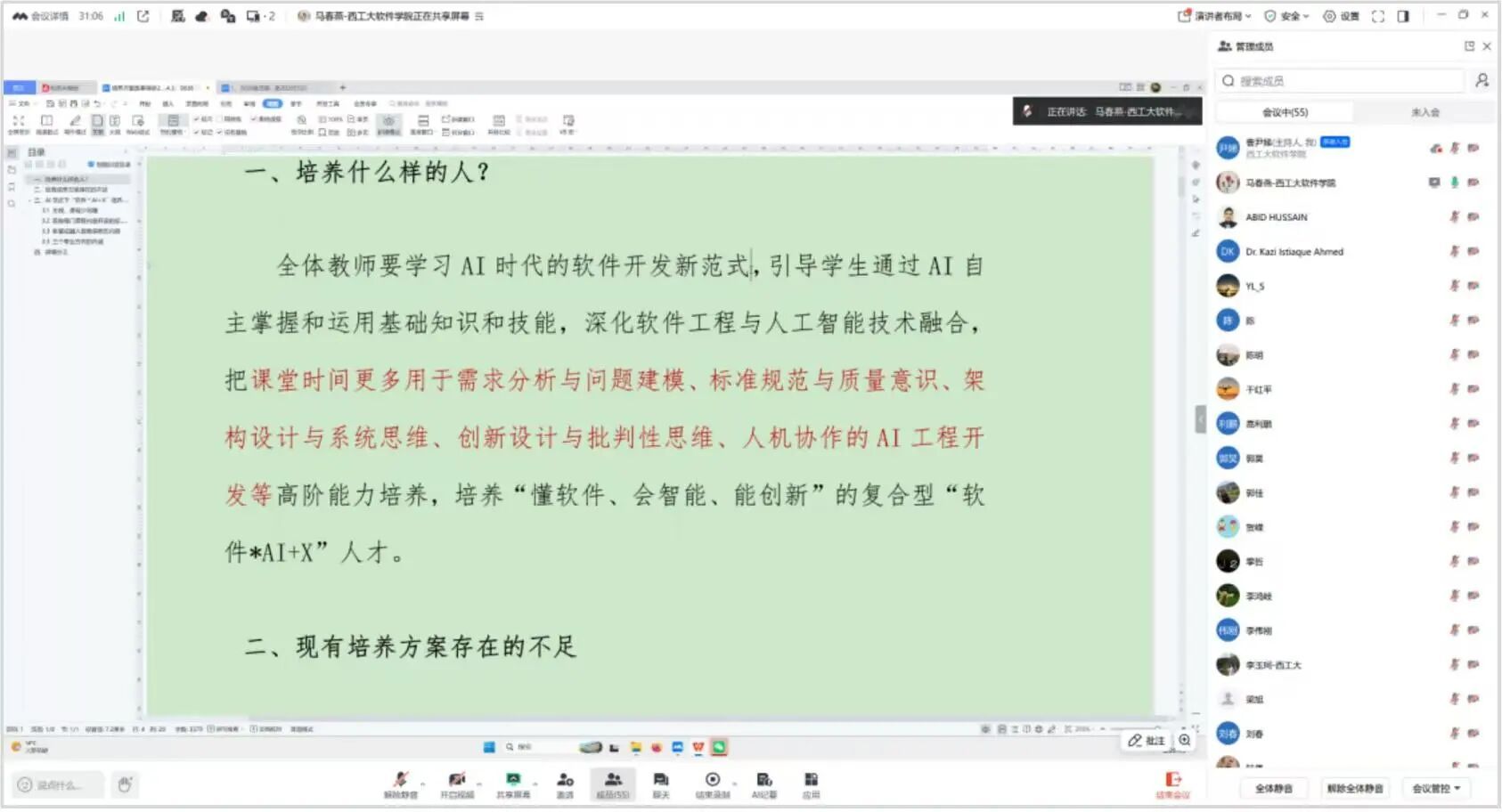 随后,马春燕基于前期的调研与学习,详细介绍了“软件*AI+X”转型的主要思路,从“培养什么样的人”“现有培养方案的不足”“AI范式下如何进行课程改革”三方面展开系统讲解。她强调,全体教师必须主动学习,否则将面临职业能力退化、人才培养质量下降的严峻现实。她提出,围绕软件工程主线、AI工程主线、行业领域主线、工程实践主线、专业方向主线等五条主线,构建“少而精”的课程体系。在教学内容上,大幅删减AI可替代的机械性操作与低阶记忆内容,增加AI难以替代的抽象建模、系统设计、逻辑思维及批判性思维训练;重点强化需求分析、问题建模、架构设计及质量保障标准,并针对上述特色领域的关键场景开展案例教学与项目实践;实践环节全面转向综合性大项目训练,突出人机协作完成复杂系统级项目的能力培养。