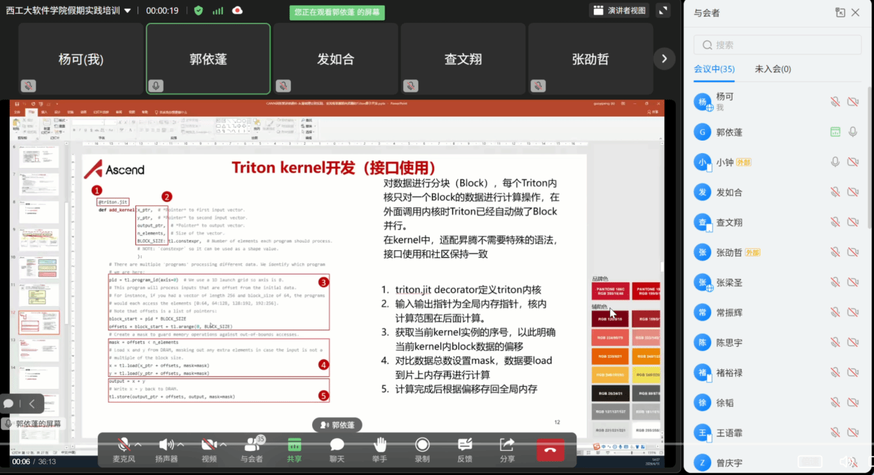 课堂上,华为专家展示了基于Triton的教学级技术方案。Triton作为一种第三方跨平台编程语言,非常适合高校实践教学:学生可以在较低起点下快速实现算子原型,并在短期内获得优秀的性能表现。
