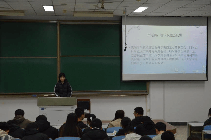 随后,校会工作人员李婧滢为在场同学详细介绍了学校层面的权益反馈渠道及流程。她讲述了如何通过校学生会、校园网、微信公众号等平台提交权益问题,并说明了反馈的处理流程和时限。李婧滢特别提醒同学们,在反馈问题时要注意信息的准确性和完整性,以便相关部门能够快速响应并解决问题。